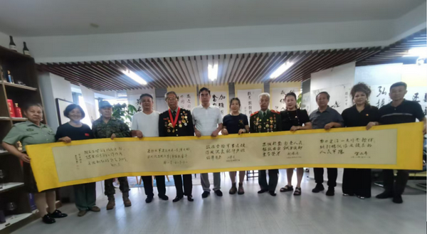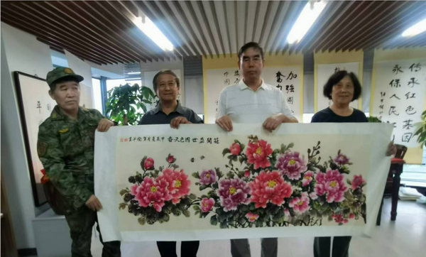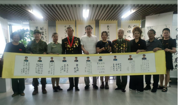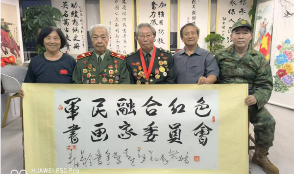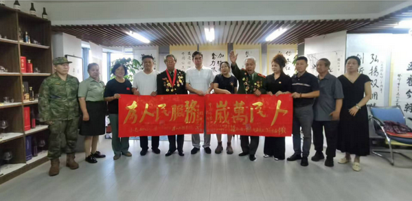慶祝中國(guó)人民解放軍建軍97周年書畫筆會(huì)(展)在嘹亮的中國(guó)人民解放軍軍歌《義勇軍進(jìn)行曲》拉開(kāi)了序幕。91歲高齡的抗美援朝戰(zhàn)斗英雄李采講述了1952年入伍(16歲)參加抗美援朝、1960年參加西藏平叛剿匪、1962年參加對(duì)印作戰(zhàn)等戰(zhàn)斗故事,同時(shí)李采館長(zhǎng)得到黃胄老師,老紅軍首長(zhǎng)王德清指導(dǎo),從沙盤走入山水畫仙境,并寫生創(chuàng)意高原景觀,是中國(guó)中外名人文化研究會(huì)理事、著名詩(shī)書畫學(xué)者,尤長(zhǎng)于山水畫研究。被戰(zhàn)友們稱為“拓荒牛”的“張思德傳人”——孔祥秀,他以英模的身份先后25次受到毛主席接見(jiàn),他作為警衛(wèi)標(biāo)兵、軍隊(duì)學(xué)習(xí)毛主席著作積極分子的典范,多次與毛主席親切握手并合影留念。天安門城樓上國(guó)慶觀禮他就站在毛主席身邊,當(dāng)毛主席聽(tīng)到天安門廣場(chǎng)上群眾高呼“毛主席萬(wàn)歲”,毛主席左手抓住欄桿,右手向前舉起高呼“人民萬(wàn)歲”!1968年1月19日,毛主席和周恩來(lái)、聶榮臻、徐向前、葉劍英等黨和軍隊(duì)領(lǐng)導(dǎo)人接見(jiàn)北京衛(wèi)戍區(qū)和中央警衛(wèi)團(tuán)英模人物,首都警衛(wèi)戰(zhàn)士共300余人參加接見(jiàn)。孔祥秀作為主席團(tuán)成員,在前排右側(cè)座位上就座。孔祥秀此刻已經(jīng)肩負(fù)起抗美援越中的戰(zhàn)斗任務(wù),忍不住向毛主席說(shuō)出了自己的心里話:“毛主席呀,我們明天就要去抗美援越了,我一定要把所有戰(zhàn)士都安全地給您帶回來(lái)。”主席微笑著使勁地再握一下孔祥秀的手,高興地說(shuō):“好!好!好!”。孔祥秀踐行書寫“人民萬(wàn)歲”、“為人民服務(wù)”67年。著名書畫家北京百年風(fēng)云文化藝術(shù)中心軍民融合紅色書畫家委員會(huì)北京、臺(tái)創(chuàng)園主席賀衛(wèi)平、劉青即興創(chuàng)作并捐贈(zèng)30余幅慶祝中國(guó)人民解放軍建軍97周年及雙擁書畫。書畫筆會(huì)(展)在《中國(guó)人民志愿軍戰(zhàn)歌》中告一段落。